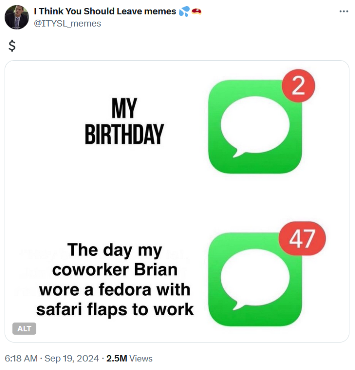 On September 18, multiple accounts used it to reference the news that the U.S. Federal Reserve cut interest rates by half a percentage point, which is a bigger deal than it sounds like and double the cut that many had predicted. The next day, people were posting the meme about the alleged relationship between Robert F. Kennedy Jr. and New York magazine reporter Olivia Nuzzi.