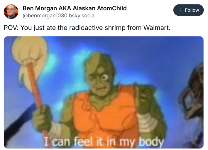 The radioactive shrimp meme was born from a viral seafood recall after Walmart warned shoppers of a radioactive isotope in their Great Value raw shrimp. This meme costume can be pulled off with neon shrimp plushies, glow-in-the-dark jewelry, and hazard tape.