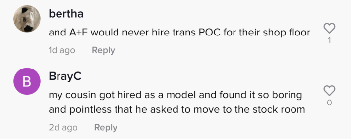 Others commented on the apparent whiteness of the company’s beauty standards at the time. “And A+F would never hire trans POC for their shop floor,” one user commented.