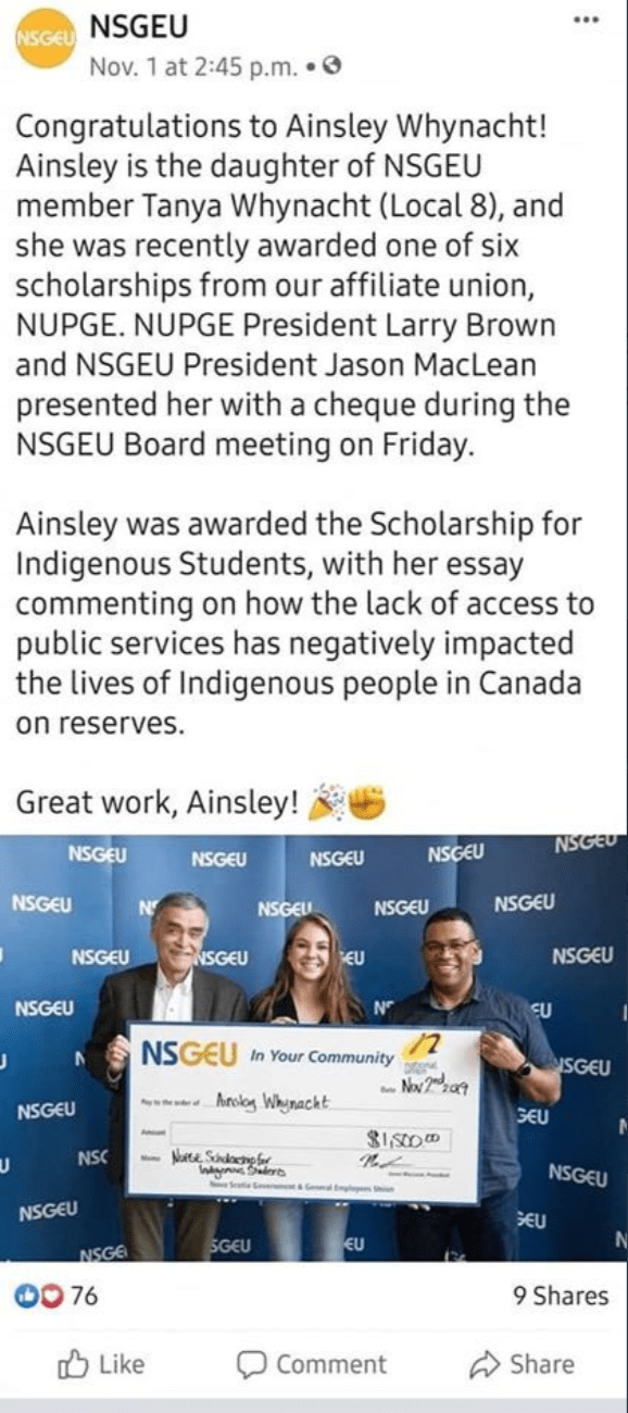 Shortly after Whynacht's posts, the Nova Scotia Government and General Employees Union (NSGEU) posted a picture of Whynacht receiving the NSGEU Scholarship for Indigenous Students on its Facebook page, along with a long congratulatory message.