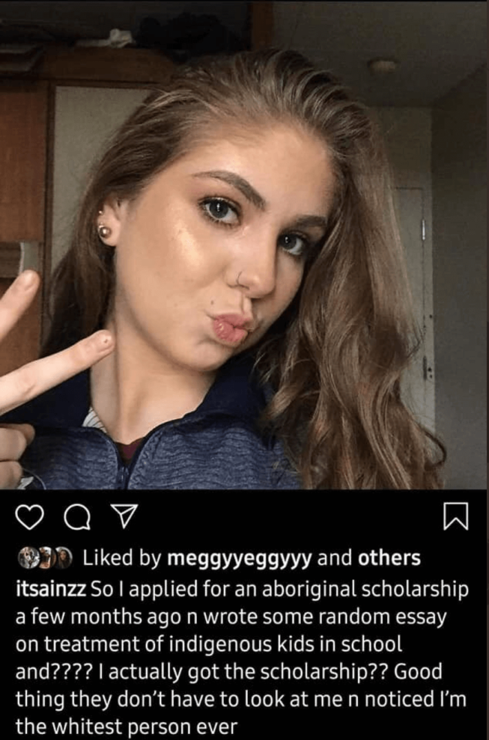 "So I applied for an aboriginal scholarship a few months ago n wrote some random essay on treatment of indigenous kids in school and???? I actually got the scholarship?? Good thing they don't have to look at me n noticed I'm the whitest person ever," Whynacht allegedly wrote in a since-deleted Instagram post.