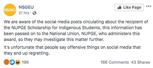 "We are aware of the social media posts circulating about the recipient of the NUSGE Scholarship for Indigenous Students, this information has been passed on to the National Union, NUPGE, who administers this award, so they may investigate this matter further. It's unfortunate that people say offensive things on social media that they end up regretting," NUSGE wrote on Facebook.