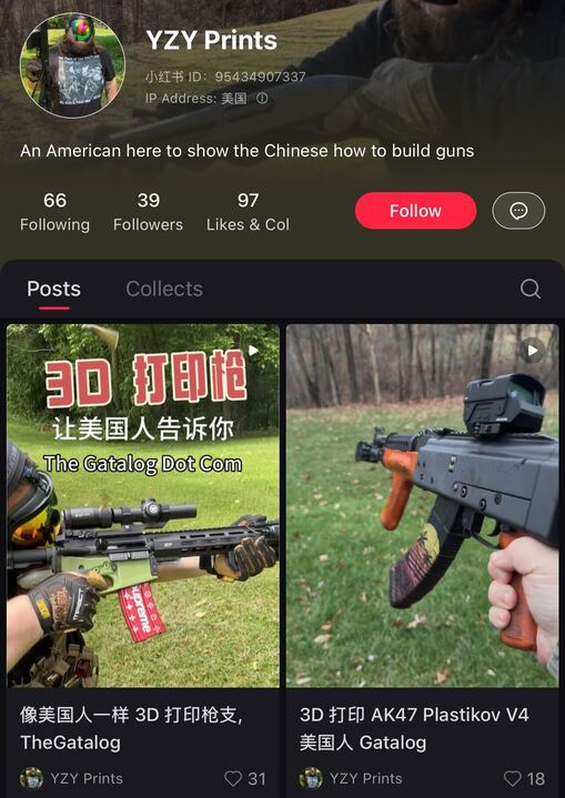 On his RedNote profile, YZY has already shared numerous videos of 3D-printed weapons alongside links to "The Gatalog," a community-driven platform that hosts 3D-printed firearm blueprints and related files.