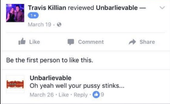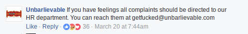 The bar responded the next day by telling her to contact "getfucked@unbarlievable.com."