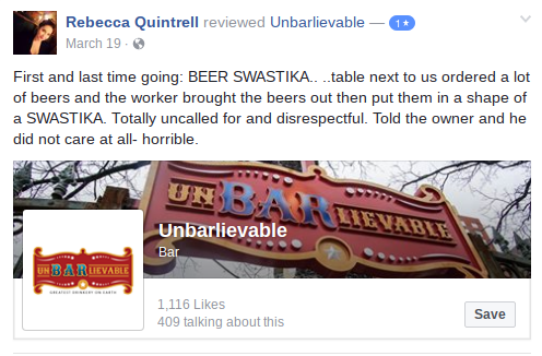 A review from March shows patron Rebecca Quintrell detailing her experience in which a server placed beers in a swastika pattern.