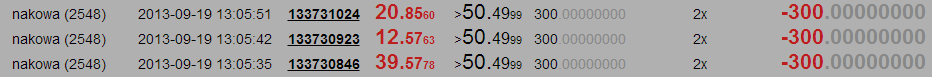 A Sunday night streak by Nakowa. The numbers on the right denote bitcoins won (green) or lost (red). In 10 seconds, Nakowa wins 1,000 bitcoins.