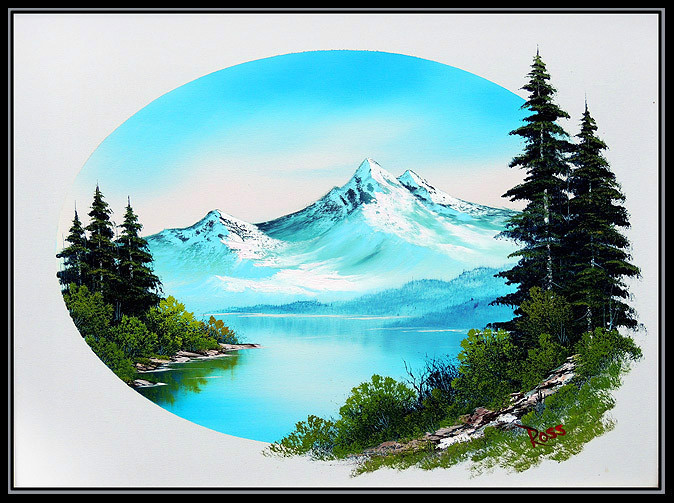 The piece is called "Oval Reflection," and according to the seller, the signed painting is a very rare, authentic wet on wet, oil painting of one of Ross's most iconic subjects: a landscape portrait.