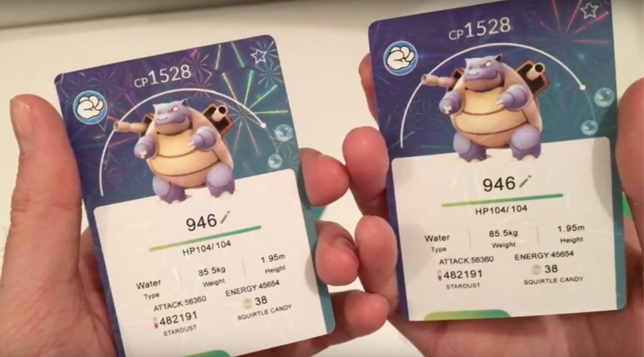 These cards appear to be garbage screengrabs from the Pokémon Go mobile game. The creators didn't even bother to remove the various clickable icons, even though they're useless on paper. Best of all, they also didn't change some of the custom names that players had chosen for their Pokémon. So, instead of Blastoise, you have "946."