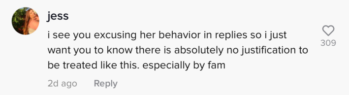 On her original video, some viewers told the TikToker that there is no excuse for her cousin to treat her this way after noticing that she was seemingly excusing her cousin's behavior in the comments section. "I know she is family, and I know how hard it is to stick up to family, but you are worthy of more than this," one commenter wrote.