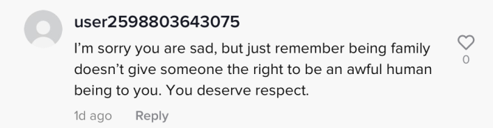 After she posted the update letting her followers know she was uninvited, another commenter similarly wrote that "being family doesn't give someone the right to be an awful human being to you." "I'm sorry you are sad," they wrote. "You deserve respect."