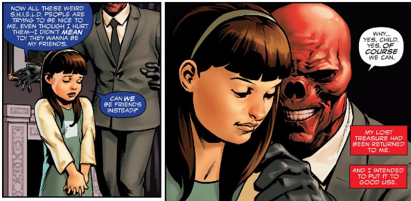 Rewinding to the recent past of Captain America comics, the second issue explains that Steve's Hydra backstory was fabricated by the Cosmic Cube, wielded by his arch-nemesis the Red Skull. Recapping some of the events of Avengers Standoff: Assault on Pleasant Hill Alpha (also written by Nick Spencer), we're reminded through a series of flashbacks that the Cosmic Cube was destroyed and reformed into the body of a young girl named Kobik. Remembering the Red Skull as her "friend," Kobik secretly joined forces with Hydra while continuing to work for S.H.I.E.L.D.