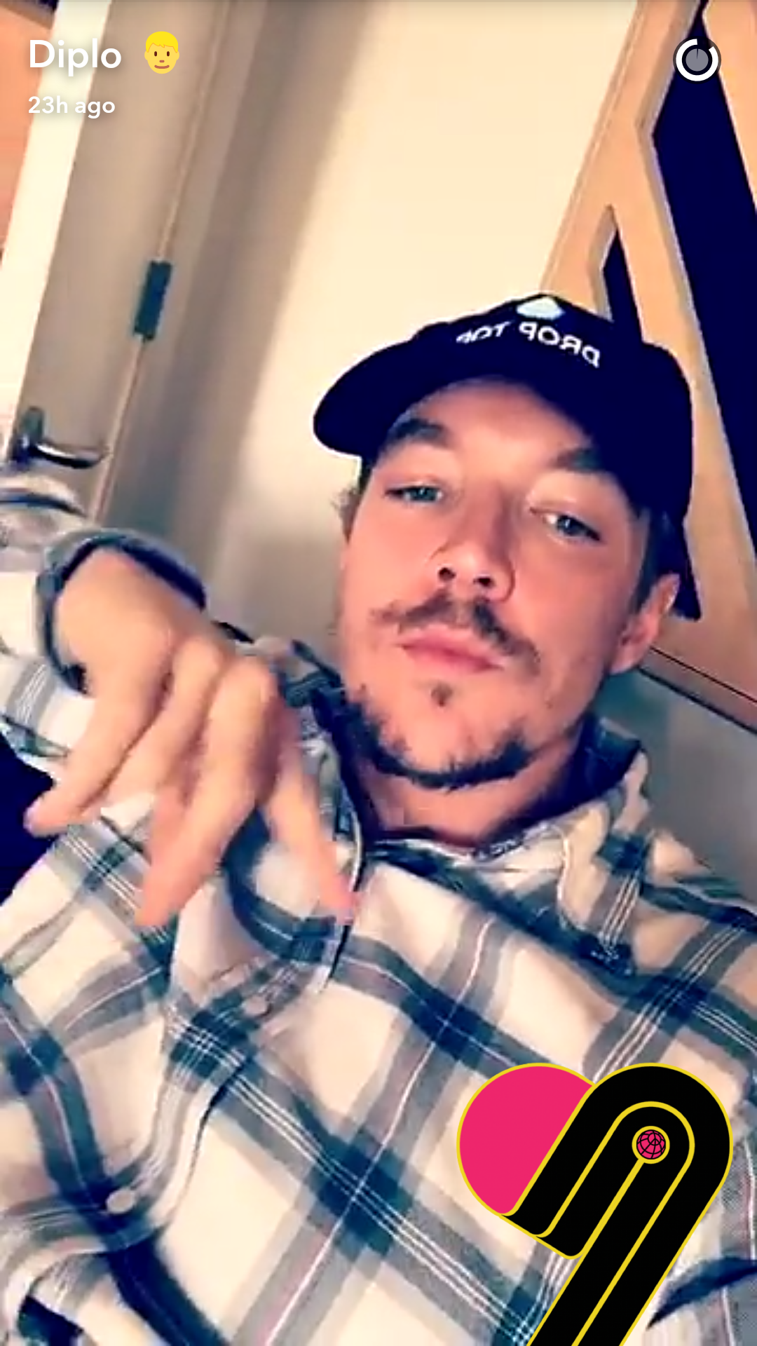 Diplo pretty much just takes a ton of selfies, photos of him traveling, and videos of his Major Lazor concerts with the fast-forward Snapchat feature.