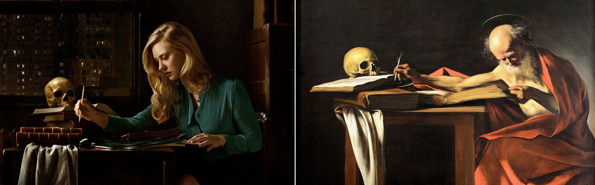 Karen's poster is the most obvious, thanks to the unexpected presence of a skull on her desk. It's clearly inspired by Caravaggio's "Saint Jerome Writing," whose title is self-explanatory: The Catholic saint is hard at work at his desk, accompanied by a skull as a memento mori—a symbolic reminder of death and mortality.