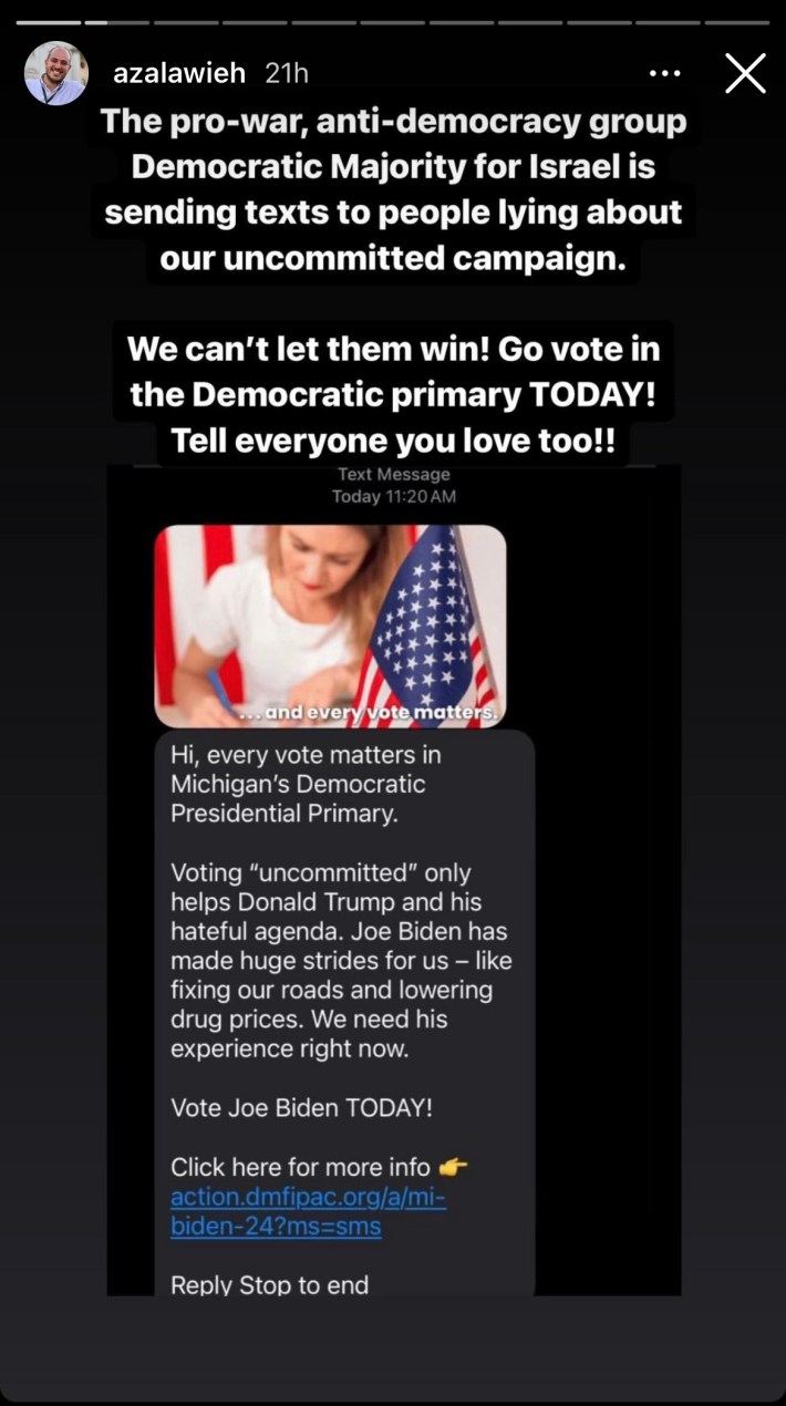 Dearborn-based political strategist Abbas Azalawieh shared a screenshot of the PAC's text blast to his Instagram story. Listen to Michigan started in Dearborn, the country's first Arab-American majority city.