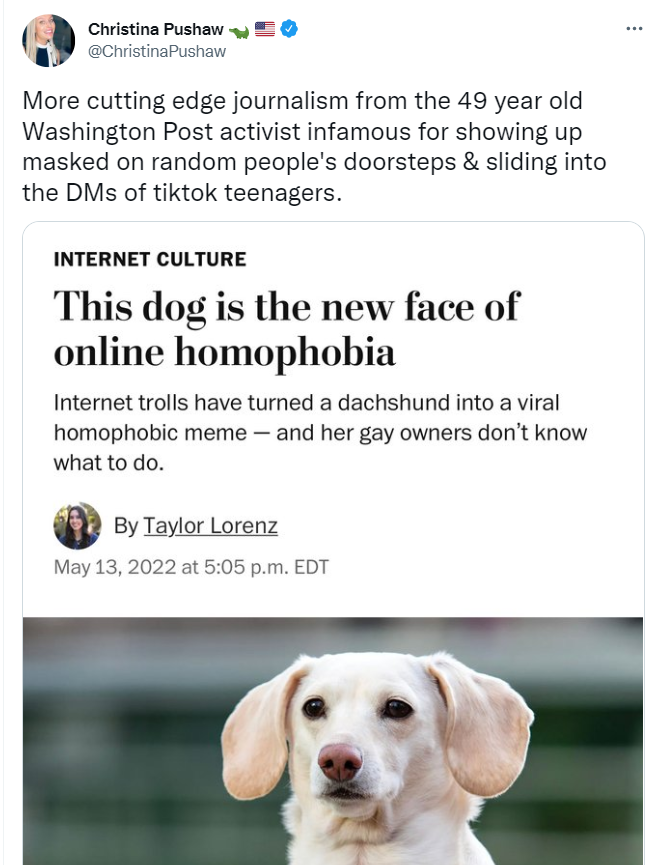 Pushaw sarcastically wrote that it was "cutting edge journalism from the ... activist infamous for showing up masked on random people's doorsteps." She's presumably referring to Lorenz attempting to contact the woman behind the influential right-wing Libs of TikTok account in an effort to confirm whether the account belongs to her.