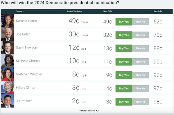 As of publication, Harris' stock is priced at 49 cents and is rising. She's followed by Biden, whose stock is 30 cents and falling, a riskier bet.