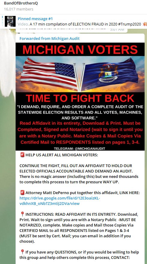 The Gateway Pundit breathlessly repeats DePerno's allegations. His claims make the rounds on Telegram, which has become a haven for the far-right. QAnon conspiracy theorists have circulated an affidavit he reportedly drafted that seeks yet another election audit. His firm's website shows him by Mike Lindell's side, being featured on early QAnon proponent Tracy "Beanz" Diaz's podcast, and as a guest on Hannity Radio. Even his tweets can cause a fervor.