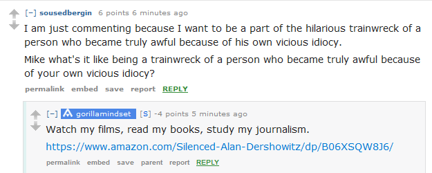 "I've broken some huge stories like the Susan Rice unmasking scandal and provided documents exposing John Conyers as a sexual harasser. I successfully crowd-funded two films and have a best-selling book on Mindset called Gorilla Mindset," Cernovich began the AMA, adding a link to his book. "I've been in front of 15 million people on 60 Minutes and lived to tell about it."