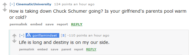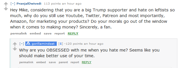 Here are some of the best questions, and answers from Cernovich, who apparently goes by "gorillamindset" on Reddit.