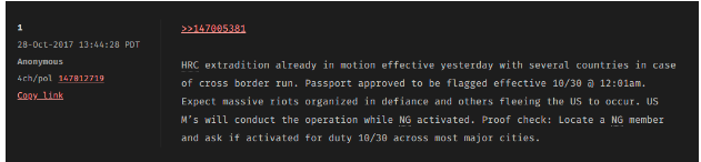 Drop #1 “claimed that “HRC extradition [was] already in motion effective yesterday with several countries in case of cross border run” with Drop #2 alleging “HRC detained, not arrested (yet)” and that there would be “massive riots organized in defiance and others fleeing the US.”