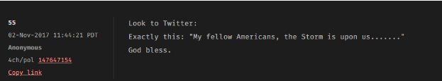 As part of the “imminent event” of the 3, Q claimed in Drop #44 that “before POTUS departs on Friday he will be sending an important message via Twitter,” used Drop #47 to warn his readers to “be vigilant today and expect a major false flag,” and claimed in Drop #55 that President Trump would unleash the massive military purge (now nicknamed “The Storm”) with a tweet reading "My fellow Americans, the Storm is upon us......."