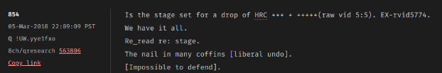 Even though she wasn’t indicted or arrested, Q predicted on March 5 in Drop #854 that “HRC +++ + +++++(raw vid 5:5)” [sic] would soon emerge, and that it would be the “nail in many coffins.”