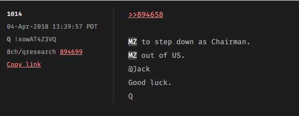 On April 4, Q claimed in Drop #1014 that Mark Zuckerberg was going to step down as chair of Facebook and flee the United States. The same day Q predicted this, Zuckerberg reiterated that he was NOT going to step down—and he still hasn’t.