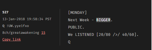 In Drop #464: Q vaguely predicted a “BIG NEXT WEEK” on Jan. 5, doubling down in Drop #527, predicting “Next Week - BIGGER,” repeating the claim three drops later.