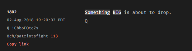 After not posting for about three weeks, Q posted in Drop #1687 that “something BIG is about to drop” with links to various press articles about QAnon. He made the exact same claim in Drops #1708, 1748, and 1802.