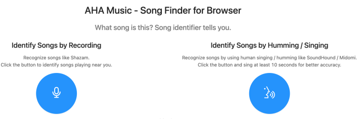 A section option allows users to have a song identified by either humming or singing instead. Like the previous option, users must click the "Identify Songs by Humming / Singing" button and allow AHA Music to analyze your voice for 10 seconds.