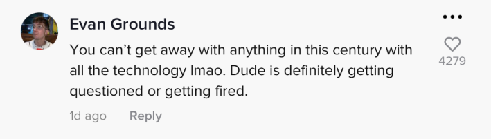 "You can't get away with anything in this century with all the technology lmao," the commenter wrote. "Dude is definitely getting questioned or getting fired."