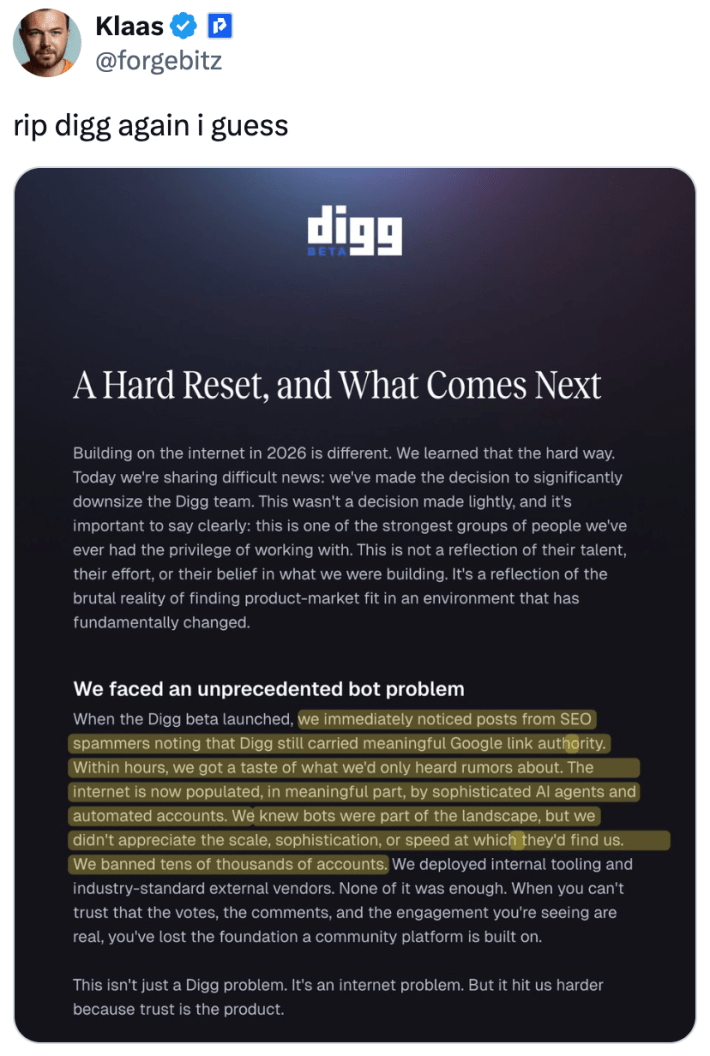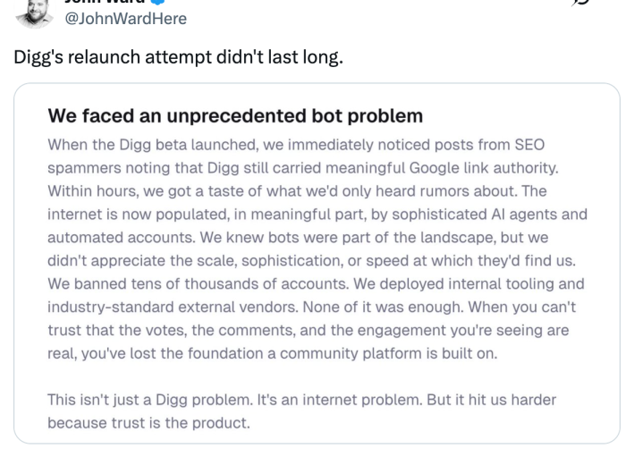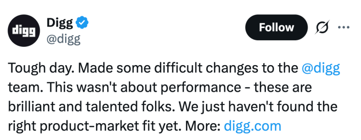 In a post on X, the official Digg account hinted that staff were laid off, writing: "Tough day. Made some difficult changes to the Digg team. This wasn't about performance - these are brilliant and talented folks. We just haven't found the right product-market fit yet."