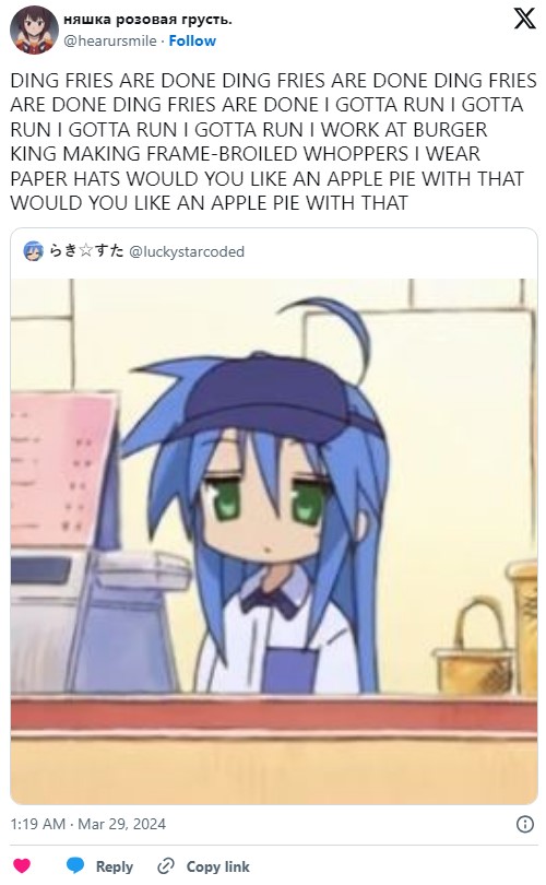 Ding Fries Are Done is the title of a parody music video—a take on "Carole of the Bells." It was originally performed by a singer known as "Billy." The song is a callback to the days of working fast food jobs in the early '90s when the song first emerged.