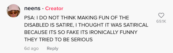She later clarified in the comment section of the video that she does not think making fun of people who are disabled is satire, but that the original videos were so "fake it's ironically funny they tried to be serious."