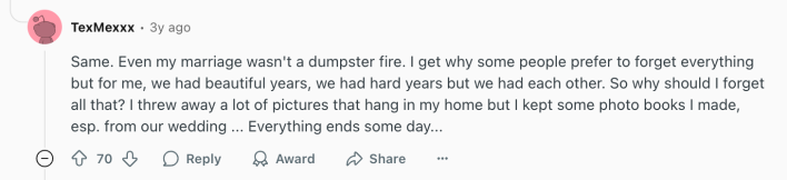 “I kept a few of my favorites. I'm glad I did. Even though the marriage was s–t, the day was good, and I looked f—---g fabulous,” wrote one person on a post entitled, “to those who are divorced: what did you do with your wedding photos?”