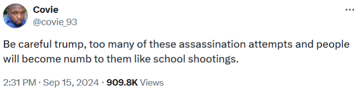 But perhaps the most alarming theme is the sentiment that so few citizens care that a former president may have been targeted for assassination twice in the space of two months. We may not be okay, in general.