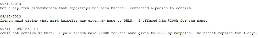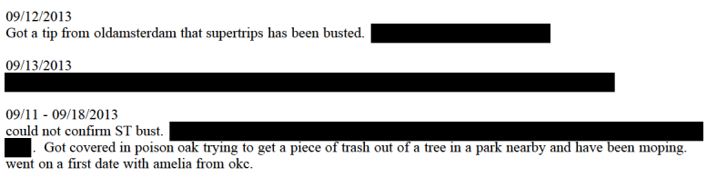 When SuperTrips, a Dutchman named Cornelis Jan Slomp and one of Silk Road’s biggest drug dealers, was arrested in September, DPR wrote in his journal that he’d received a tip about the bust. What’s next in the journal was redacted by government prosecutors: “Contacted alpacino to confirm.”