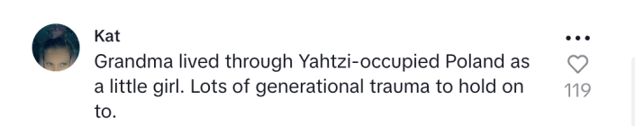 Brit finds the news depressing, writing "My mom & gma both had very traumatic lives in poverty with abusive alcoholic husbands," and Kat says, "Grandma lived through Yahtzi-occupied Poland as a little girl."