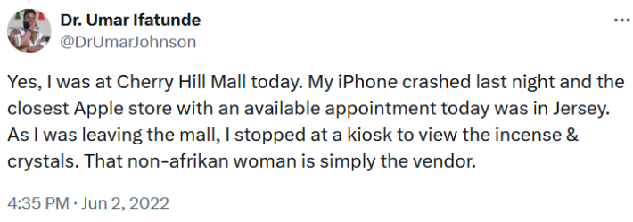 "Yes, I was at Cherry Hill Mall today," he wrote. "My iPhone crashed last night and the closest Apple store with an available appointment today was in Jersey. As I was leaving the mall, I stopped at a kiosk to view the incense & crystals. That non-afrikan woman is simply the vendor."