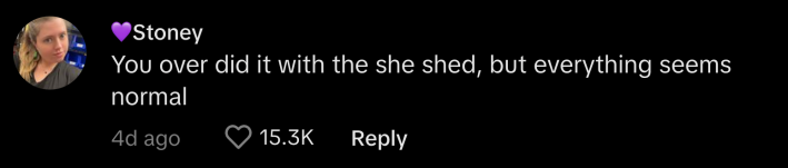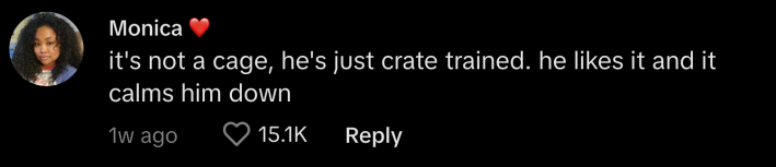 “It’s not a cage, he’s just crate trained. He likes it and it calms him down,” commented @coconutcrocs. @meganthecrazybooklady said, “You overdid it with the she shed, but everything seems normal.”