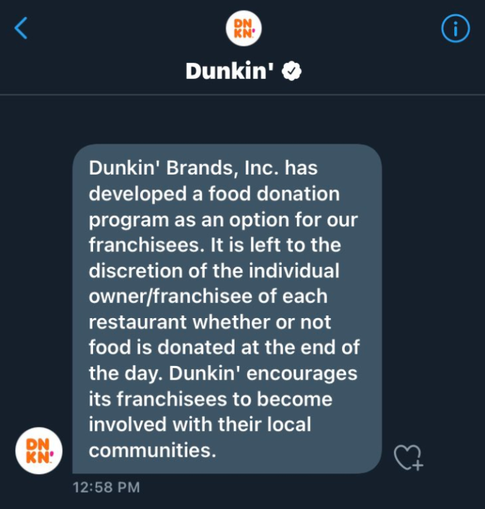 User @jaebuteraaa responded to Dunkin’ in a public tweet and said they didn’t think it was fair for the franchise owner to decide whether food was donated or not.