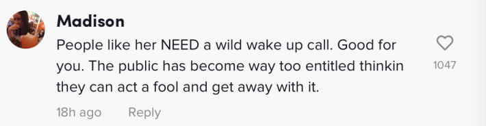 "People like her need a wakeup call," one commenter wrote. "Good for you. The public has become way too entitled thinking they can act a fool and get away with it."