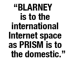 According to Drake, beneath the umbrella of FAIRVIEW, programs like BLARNEY collect and analyze the data that is made accessible by secret arrangements like the one with Global Crossing. “BLARNEY is a key access program facilitated by these commercial arrangements that exploits the Internet data at these junctions,” Drake said. “BLARNEY is to the international Internet space as PRISM is to the domestic.”