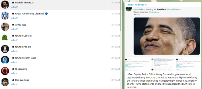 The JFK Jr. channel posted the image at 8:12am. Ron Watkins and Q Speaking channels shared it at the same time. (It's unclear if Watkins controls this channel or if it simply uses his name and picture.)