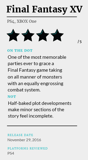 For better or worse, there's never been a Final Fantasy quite like Final Fantasy XV. In a series where mainline installments bear no relation to each other, this "sequel" makes the most of its creative freedom with a number of firsts for the series. At the forefront of this is a combat system that moves quick for a JRPG and an unusual party of fraternal friends. For fans, it's practically impossible to play Final Fantasy XV without recalling the game's storied 10-year development. It's not necessarily a bad thing; even after putting in 100 hours of playtime, I was still in awe, telling myself that this game actually exists, plot holes and all.