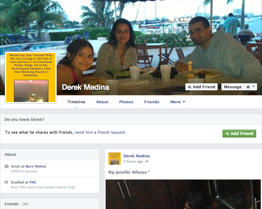 After 31-year-old Miami resident Derek Medina allegedly murdered his wife earlier this morning, he snapped a photograph of her bloody body and uploaded it to Facebook. That was followed by a full confession—again, posted directly to his Facebook page (since removed).