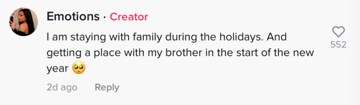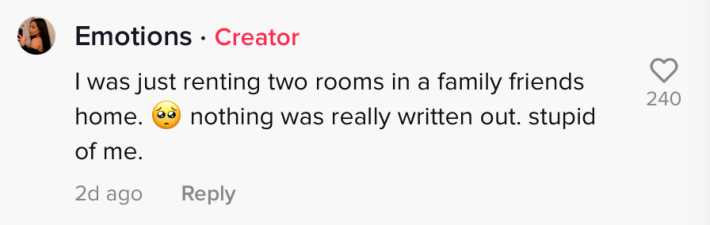 In her comment section, @emeraldemotion wrote that she had been living with a family friend who asked her to leave with no notice. She says there was no written contract.