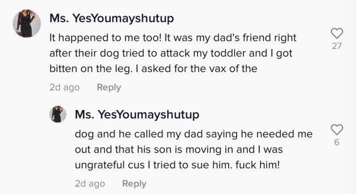 "It was my dad's friend right after their dog tried to attack my toddler and I got bitten on the leg," they wrote. "I asked for the vax of the dog and he called my dad saying he needed me out and that his son was moving in and I was ungrateful (because) I tried to sue him."