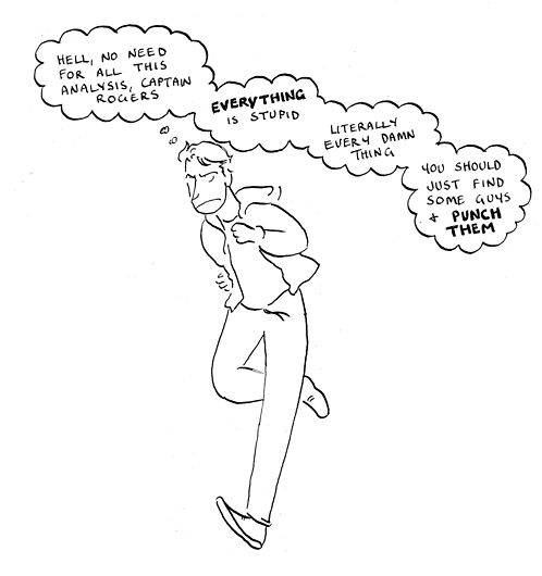 And he was messed up in The Avengers, too. The Avengers is a weird movie that seems to try very hard to produce some kind of psychological resolution for its characters, but also, Steve is introduced by literally trying to punch away visual flashbacks to the war in which his best friend died and then he did. I’m sure he felt pretty cool after beating up some aliens in New York, but he’s introduced with an explicit visual depiction of his having PTSD, and that unfortunately doesn’t go away just because you had a victory, or because the world really is as dangerous as your instincts are constantly telling you sometimes. In fact, it’s the “sometimes” that’ll really get you.