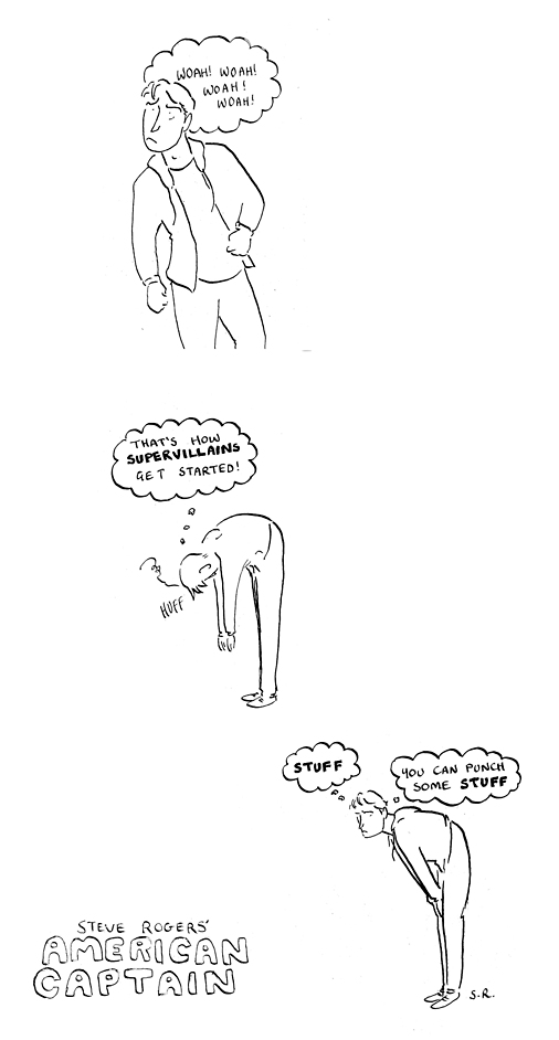 Meanwhile, I personally used to draw autobio comics in the “indie” style way back in the day. In fact, I used to draw pretty much the exact comic that Steve is drawing now, although obviously my life was less interesting than his is and it wasn’t called American Captain. So initially AmCap was just a straight-up meta joke: “lol what if Steve did indie comics like the ones I used to do?” It was exactly that flip, and it was also, if I recall correctly, approximately three in the morning. And I drink.